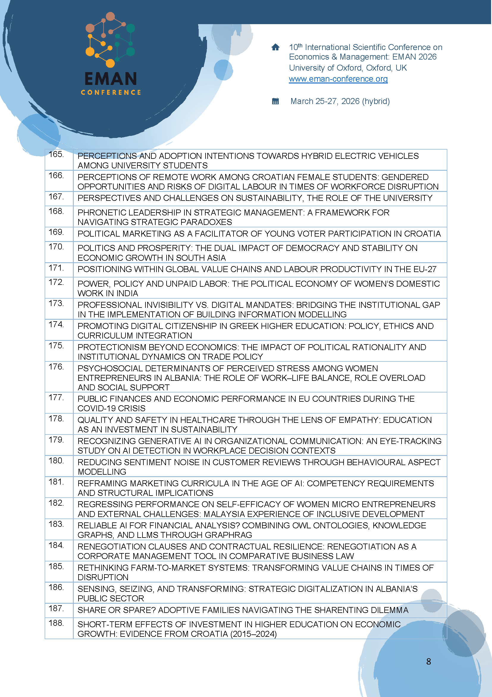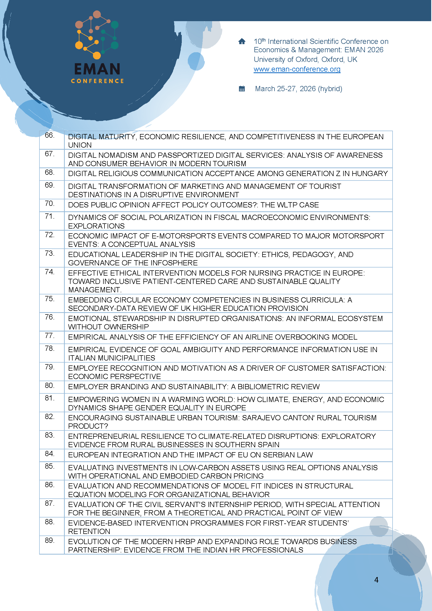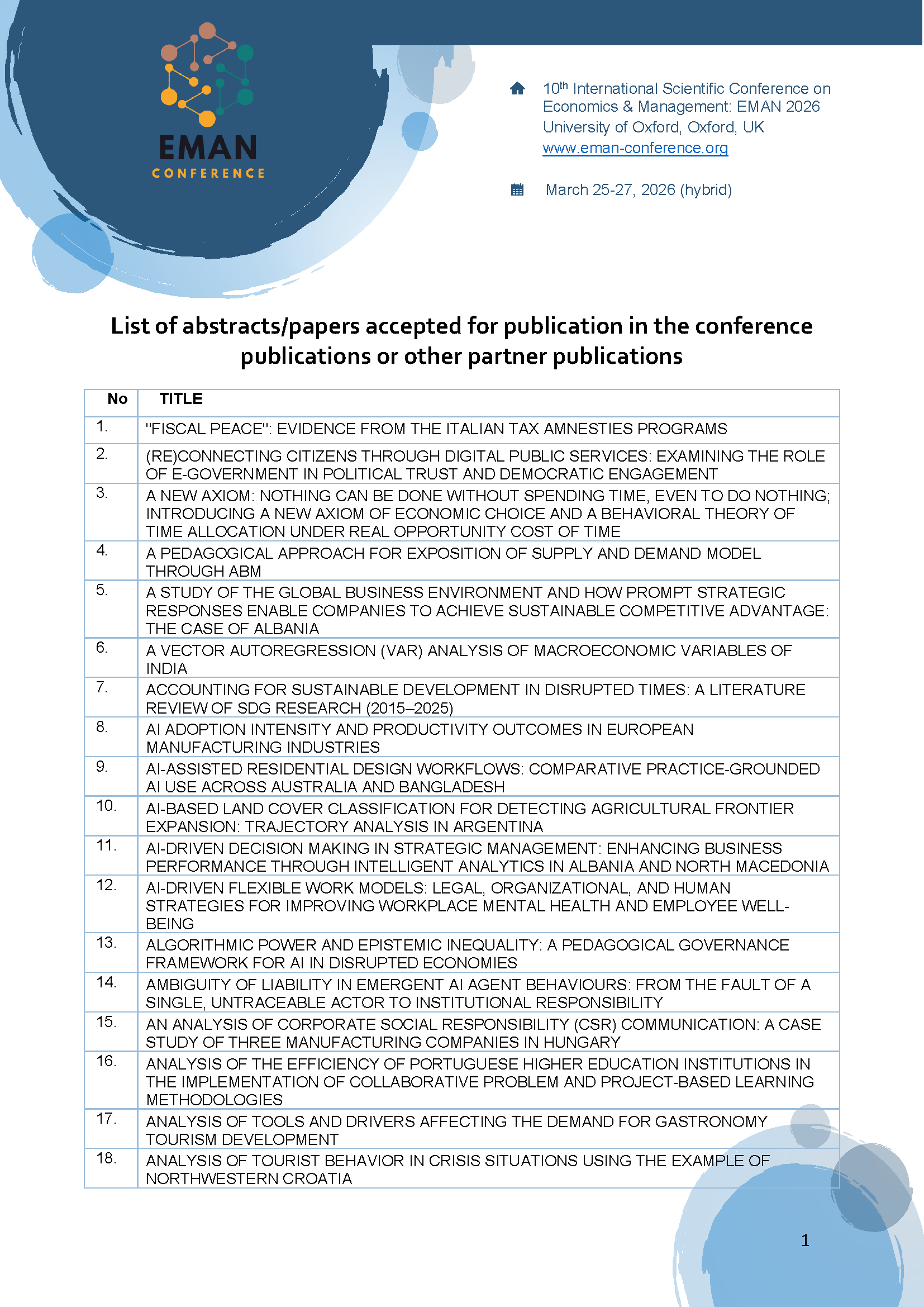 International Scientific Conference on Economics & Management (EMAN) 2026, Oxford, UK, March 25-27, by Springer within the book series