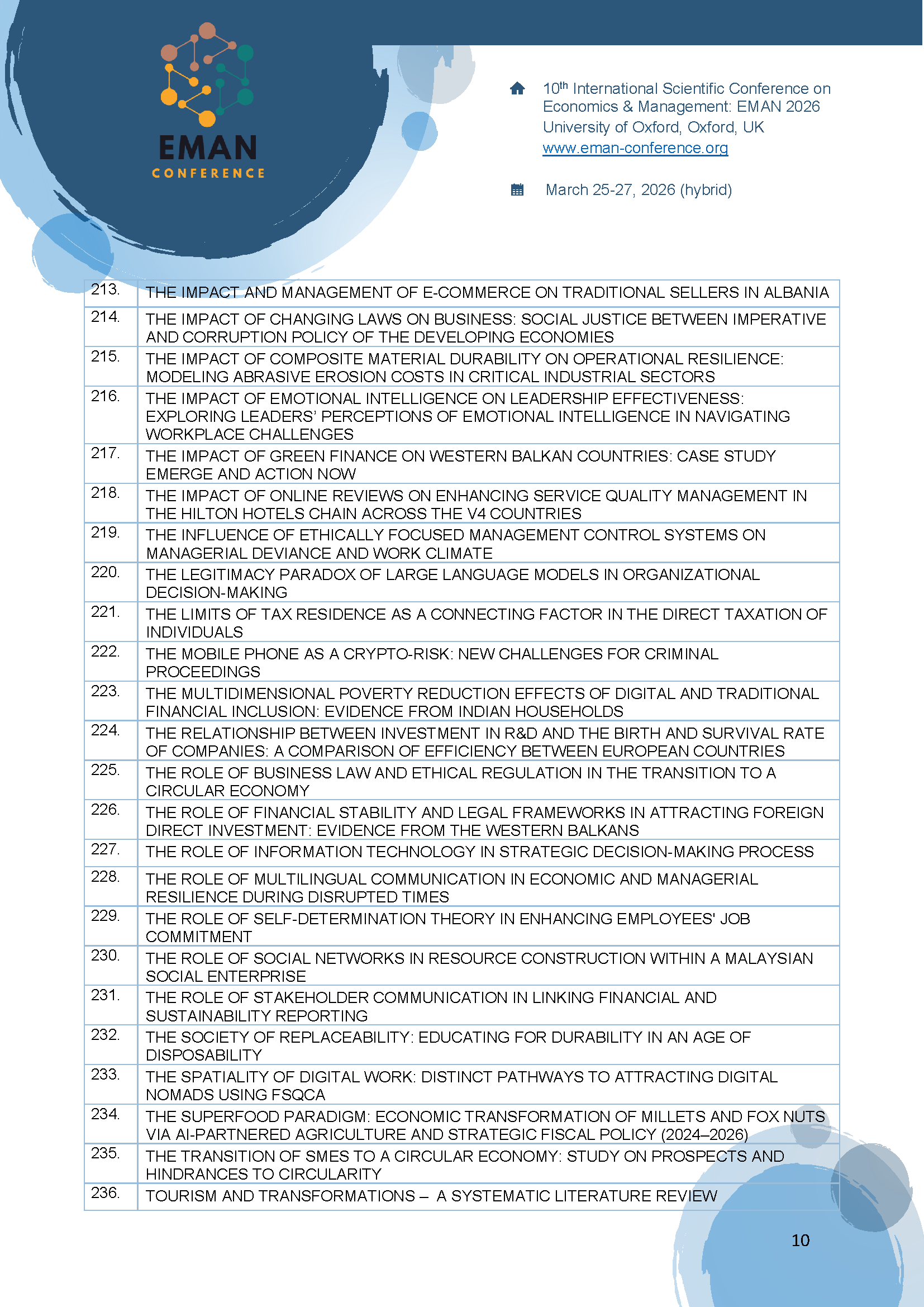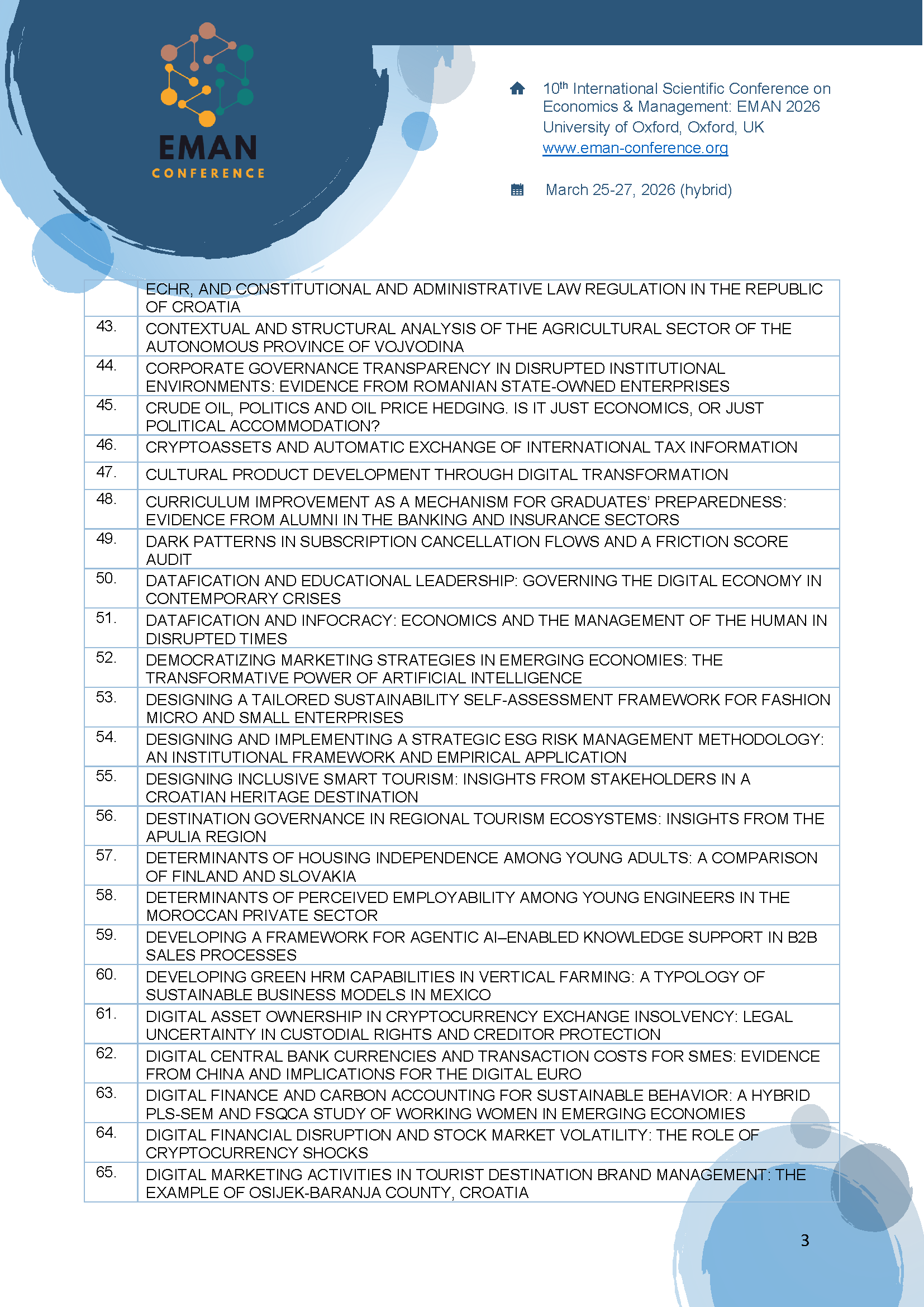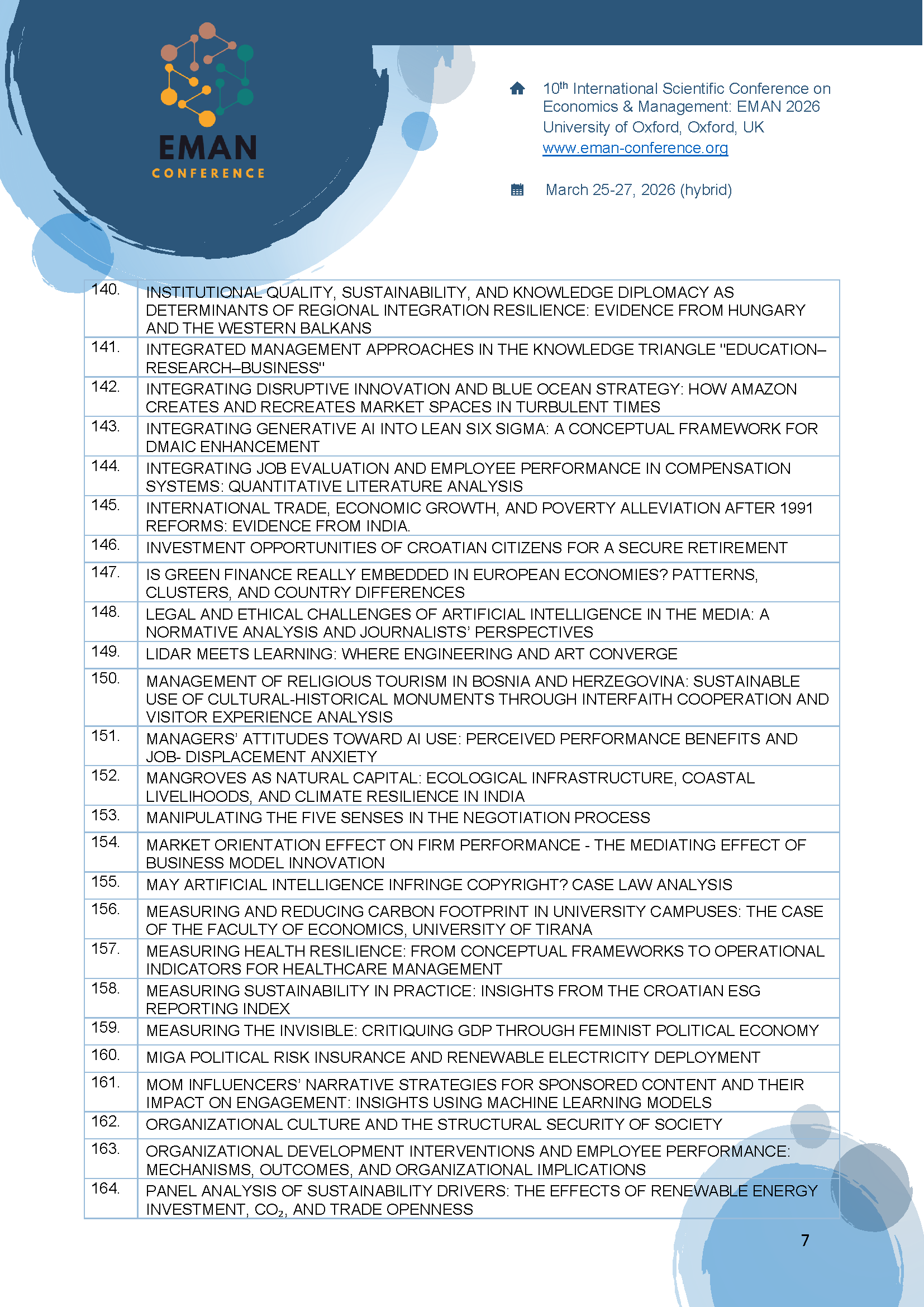 International Scientific Conference on Economics & Management (EMAN) 2026, Oxford, UK, March 25-27, by Springer within the book series