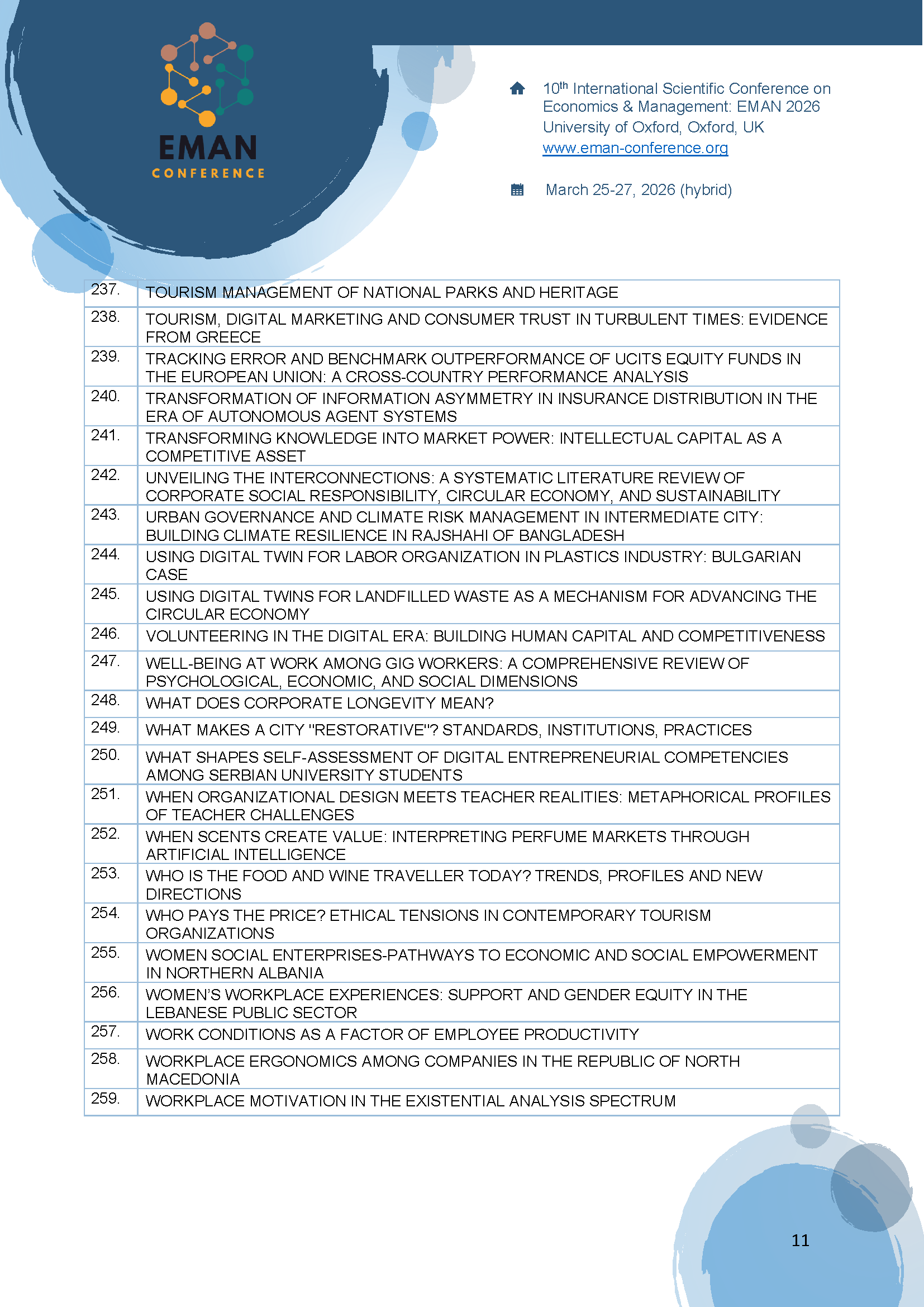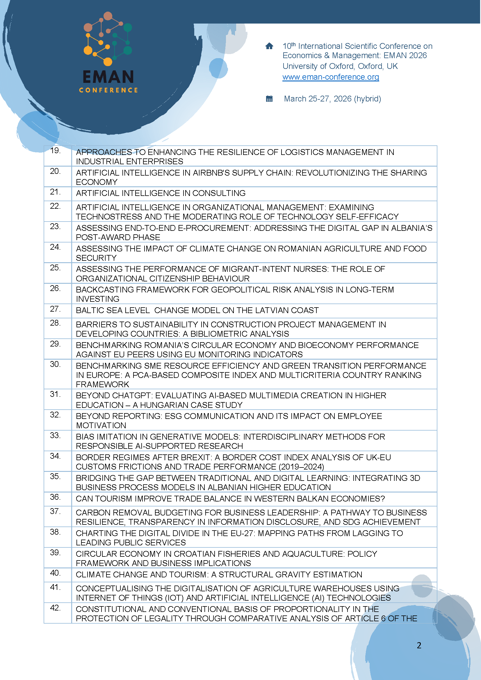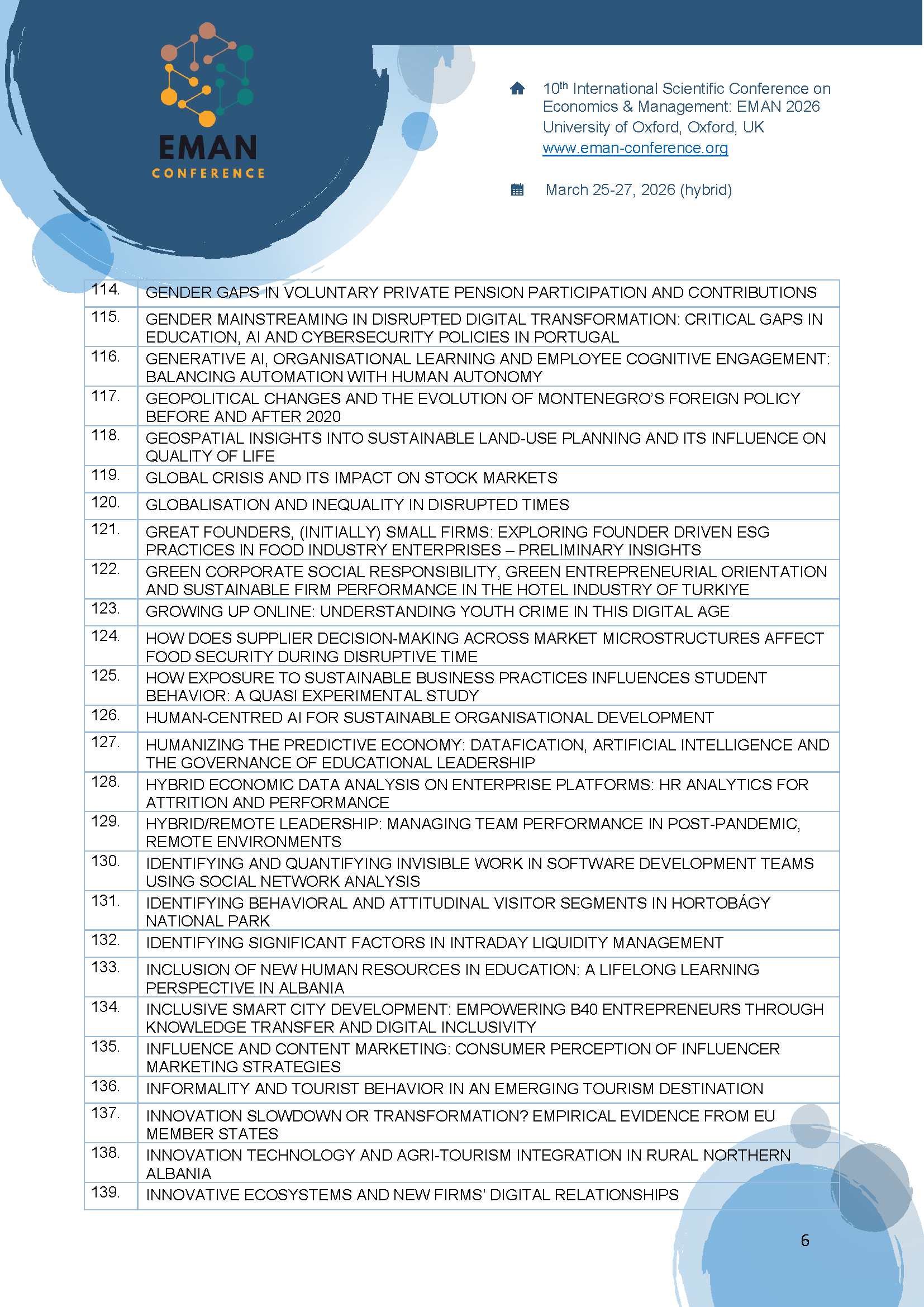 Other, non-selected full papers, but accepted for the conference, will be published in the EMAN Conference Proceedings, ISSN 2683-4510 (ISBN and DOI numbers will be assigned).